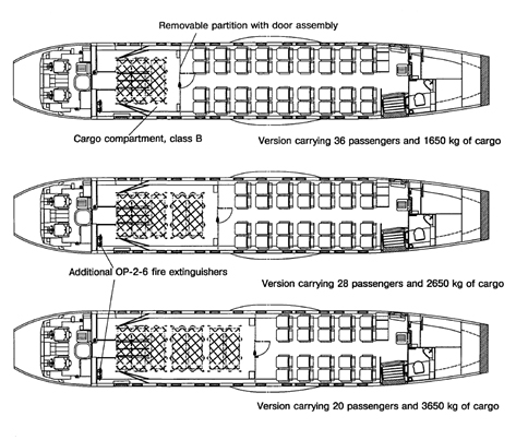 در یک مدل، هواپیما قابلیت حمل ۱۶۵۰ کیلوگرم بار و ۳۶ نفر مسافر دارد، در مدل دیگر، هواپیما قابلیت حمل ۲۶۵۰ کیلوگرم بار و ۲۸ نفر مسافر و در مدل دیگر نیز، هواپیما قادر است ۳۶۵۰ کیلوگرم بار و ۲۰ نفر مسافر را حمل کند که در صورت عدم حمل بار، مجموعاً همه مدل‌ها قابلیت حمل ۱۰۰ مسافر را دارند.