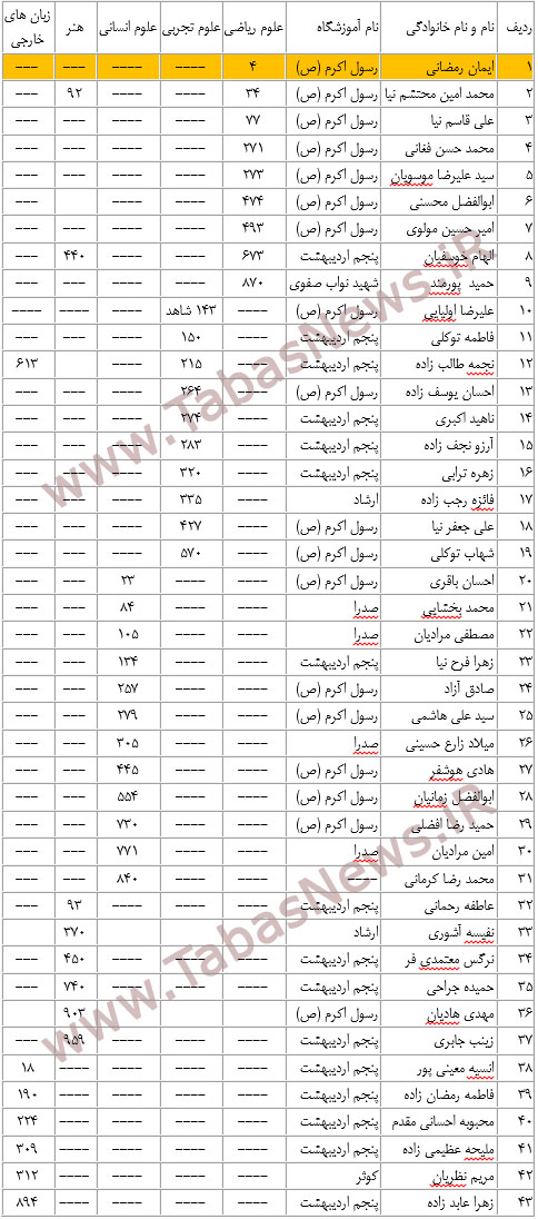 به گزارش پایگاه اطلاعرسانی طبس، برترین و ممتازان کنکور سراسری به شرح ذیل میباشند: