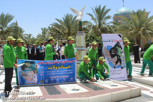 دوندگان دوی استقامت «جاده ولایت» با پیمودن مسیر شلمچه(محل ورود تاریخی امام رضا(ع) به ایران) تا مشهد مقدس روز جمعه وارد شهر طبس شدند؛ این کاروان مسیر ۲ هزار کیلومتری شلمچه تا مشهد را طی خواهد کرد.