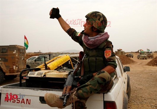 یک رزمنده پیشمرگ کرد عکس سلفی میگیرد