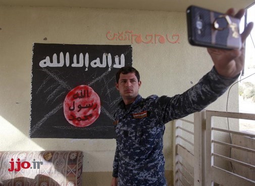 یک مامور پلیس ائتلاف در زمان درگیری با تروریستها در محله وحده در شرق موصل، روبروی پرچم تروریستهای داعش، عکس سلفی میگیرد