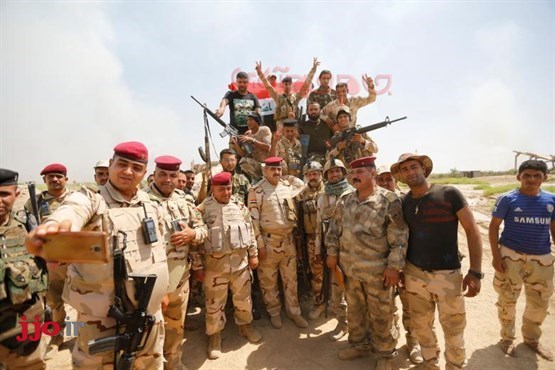 نیروهای امنیتی عراق در کنار رزمندگان شیعه در نزدیکی خط اول جبهه جنگ با تروریستهای داعش در فلوجه عراق، عکس یادگاری میگیرند