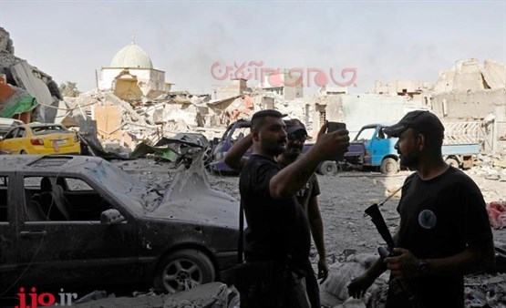نیروهای ضد تروریست، روبروی خرابههای مسجد النوری در بخش قدیمی شهر موصل، پس از بازپس گیری منطقه از تروریستهای داعش، عکس سلفی میگیرند